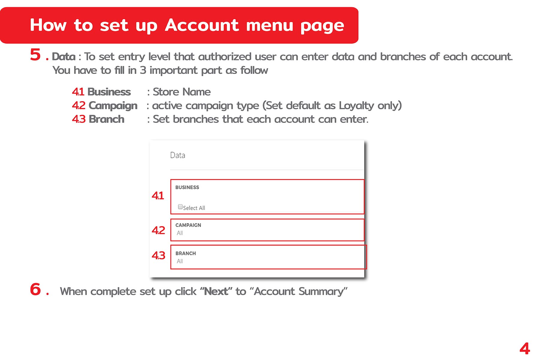 Account Menu Use for set up authorize as Web Admin user and to add or delete account that using App Merchant in each branchs as instruction below