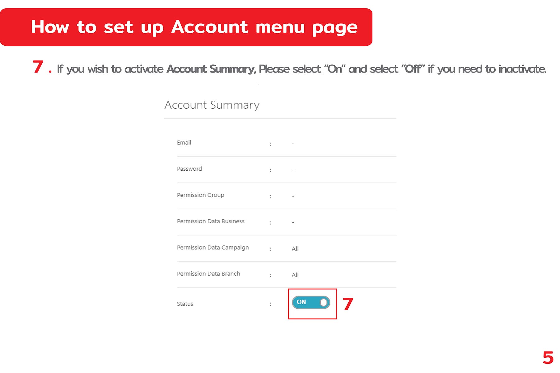 Account Menu: Use for set up authorize as Web Admin user and to add or delete account that using App Merchant in each branchs as instruction below