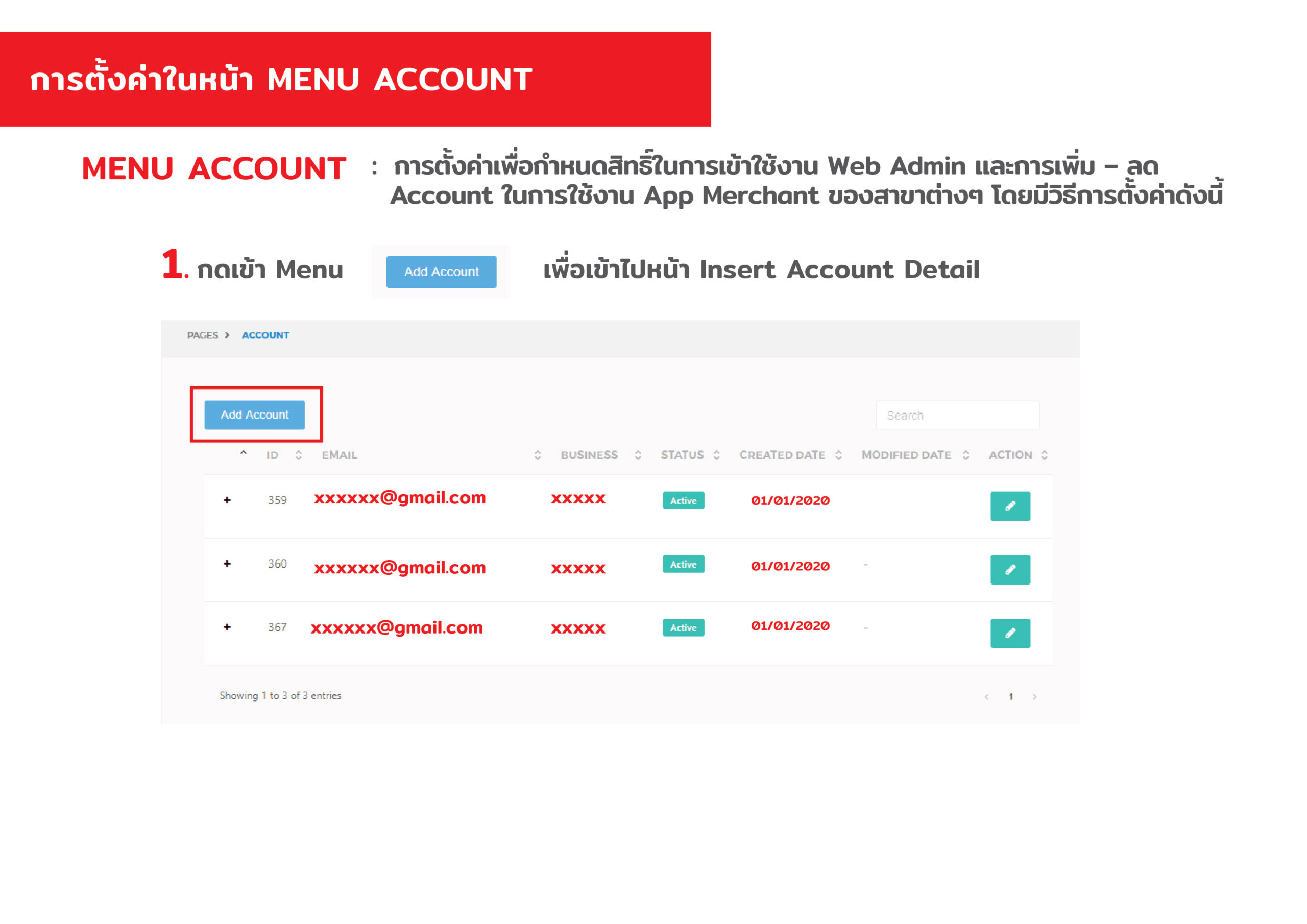 Menu Account การตั้งค่าเพื่อกำหนดสิทธิ์ในการเข้าใช้งาน Web Admin และการเพิ่ม – ลด Account ในการใช้งาน App Merchant ของสาขาต่างๆ โดยมีวิธีการตั้งค่าดังนี้