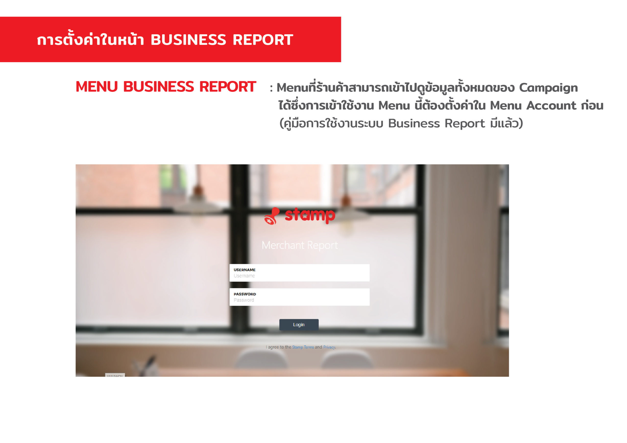 Business report Menu ที่ร้านค้าสามารถเข้าไปดูข้อมูลทั้งหมดของ Campaign ได้ซึ่งการเข้าใช้งาน Menu นี้ต้องตั้งค่าใน Menu Account ก่อน