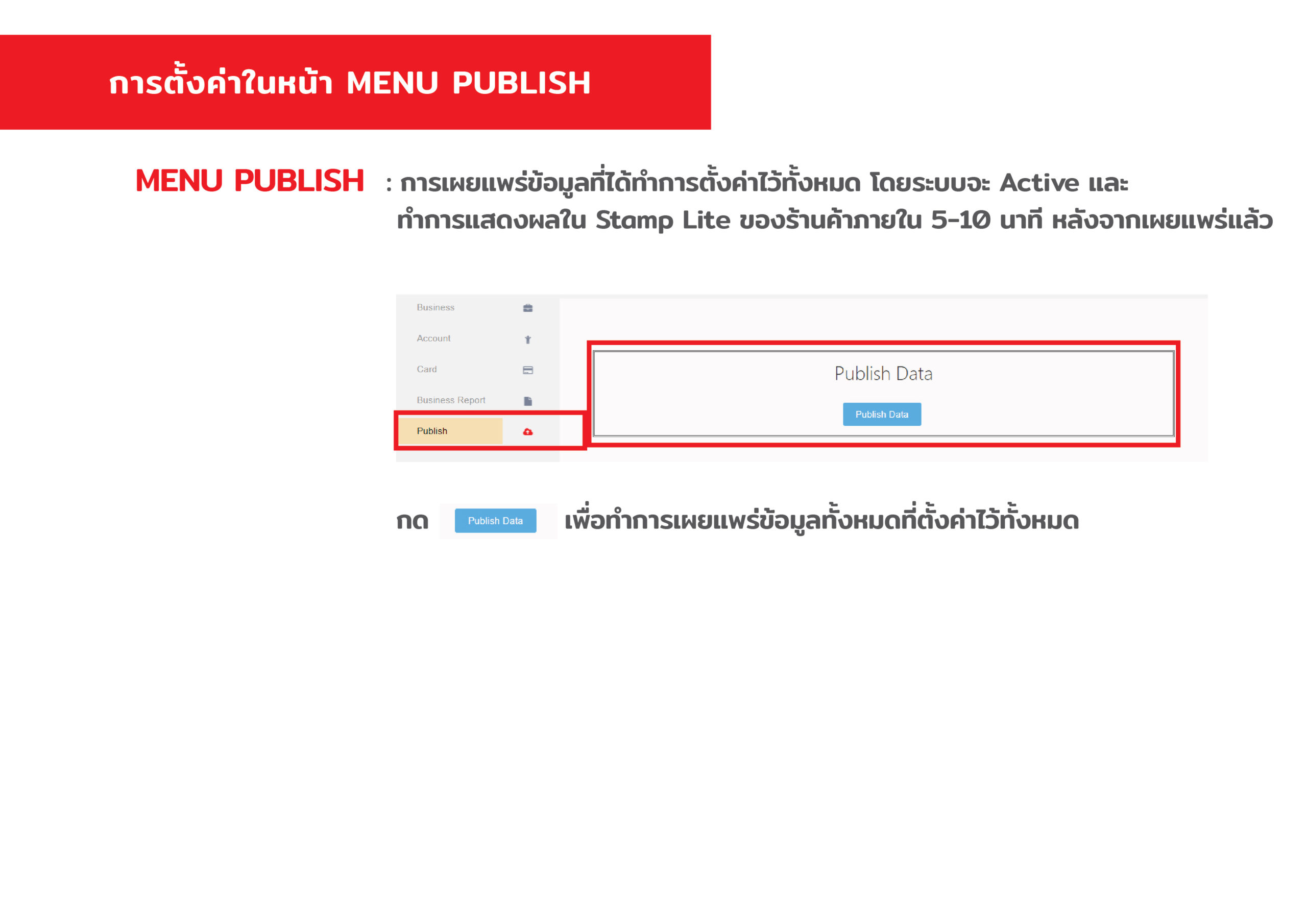 Manu Publish การเผยแพร่ข้อมูลที่ได้ทำการตั้งค่าไว้ทั้งหมด โดยระบบจะ Active และทำการแสดงผลใน Stamp Lite ของร้านค้าภายใน 5-10 นาที หลังจากเผยแพร่แล้ว